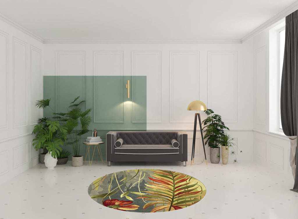 8' Blue And Green Round Wool Tropical Botanical Hand Tufted Area Rug