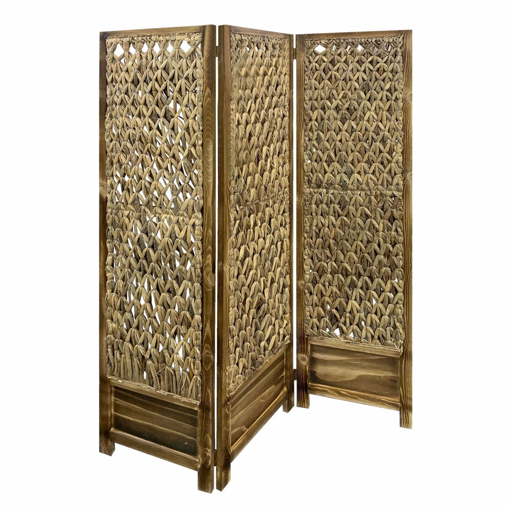 Bring a casualness to any space or room with the spectacular and colorful natural vibes of this Casual Wood and Seagrass 3 Panel Room Divider Screen. Intricately crafted with woven seagrass, this room divider is a brilliant fusion of function and easy going natural style. This screen can be used as a freestanding room partition, temporary wall to conceal clutter, or as a decorative accent piece to decorate a large space. It is versatile enough to allow for moderate lighting and sound to pass through. This artistic piece doubles up as a compelling piece of decorative ornament, to give your space just the right kind of lift. This screen can easily connect several screens together to create a larger room partition. 67" x 48" x 1"