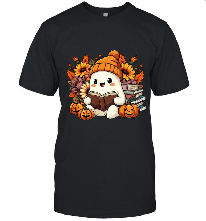 Cute Ghost Reading Book Pumpkin Flowers Long Sleeve T-Shirt_1